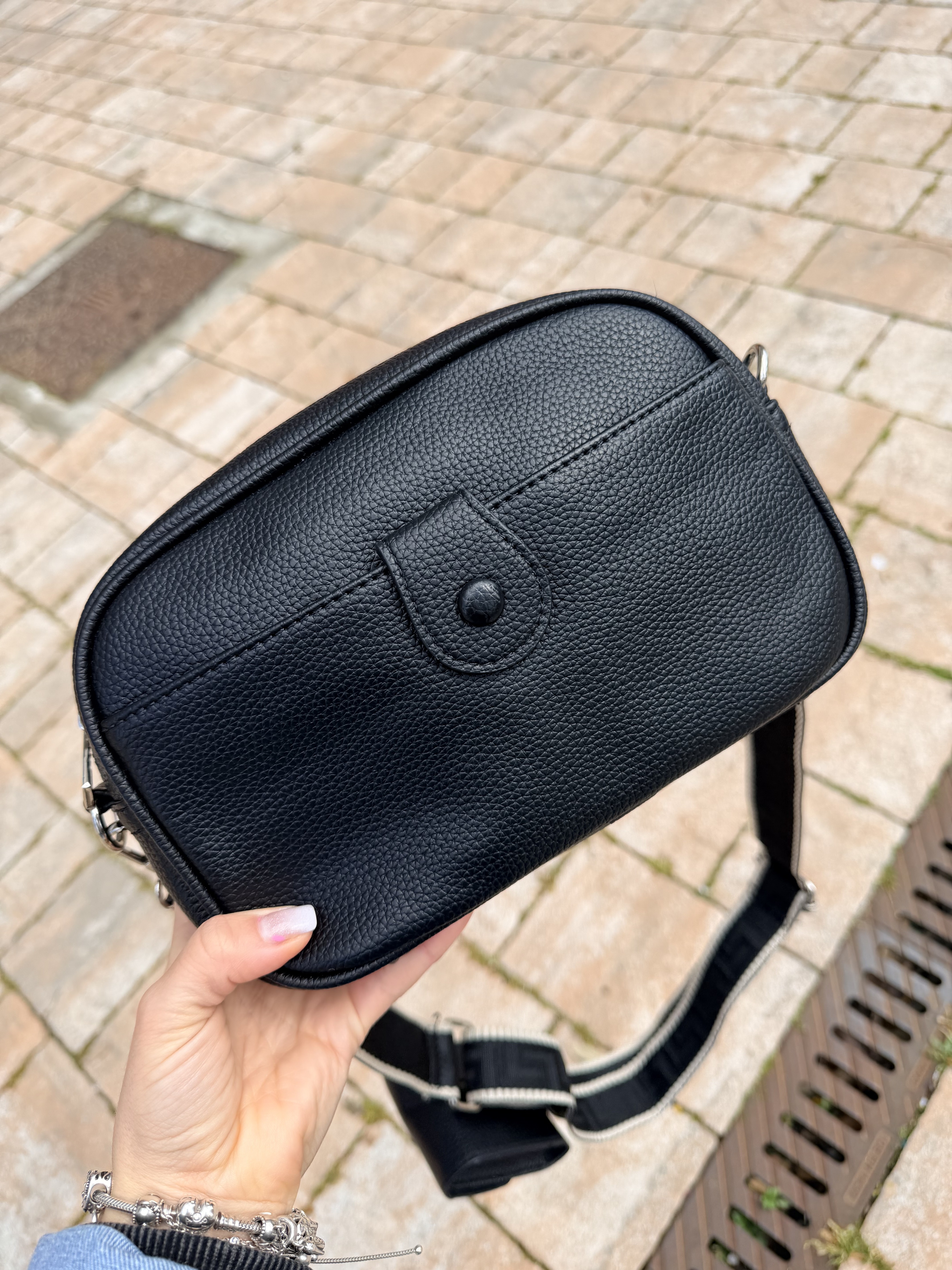 Una borsetta comodissima per tutti i giorni, con la tracolla in tessuto regolabile con agganciatura per il portamonete/ porta sacchettini ...