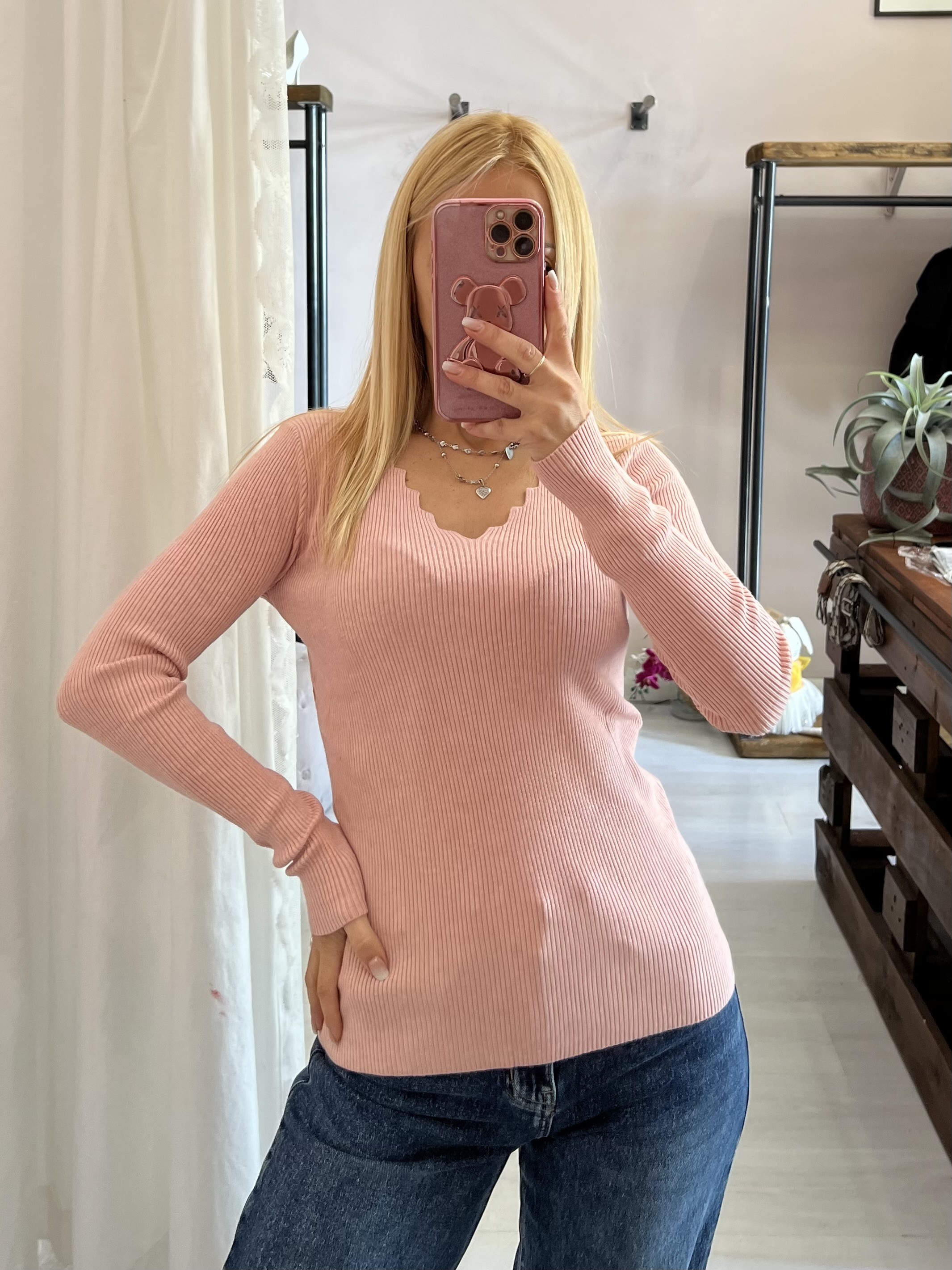 Maglioncino scollo a V ondulato viscosa rosa