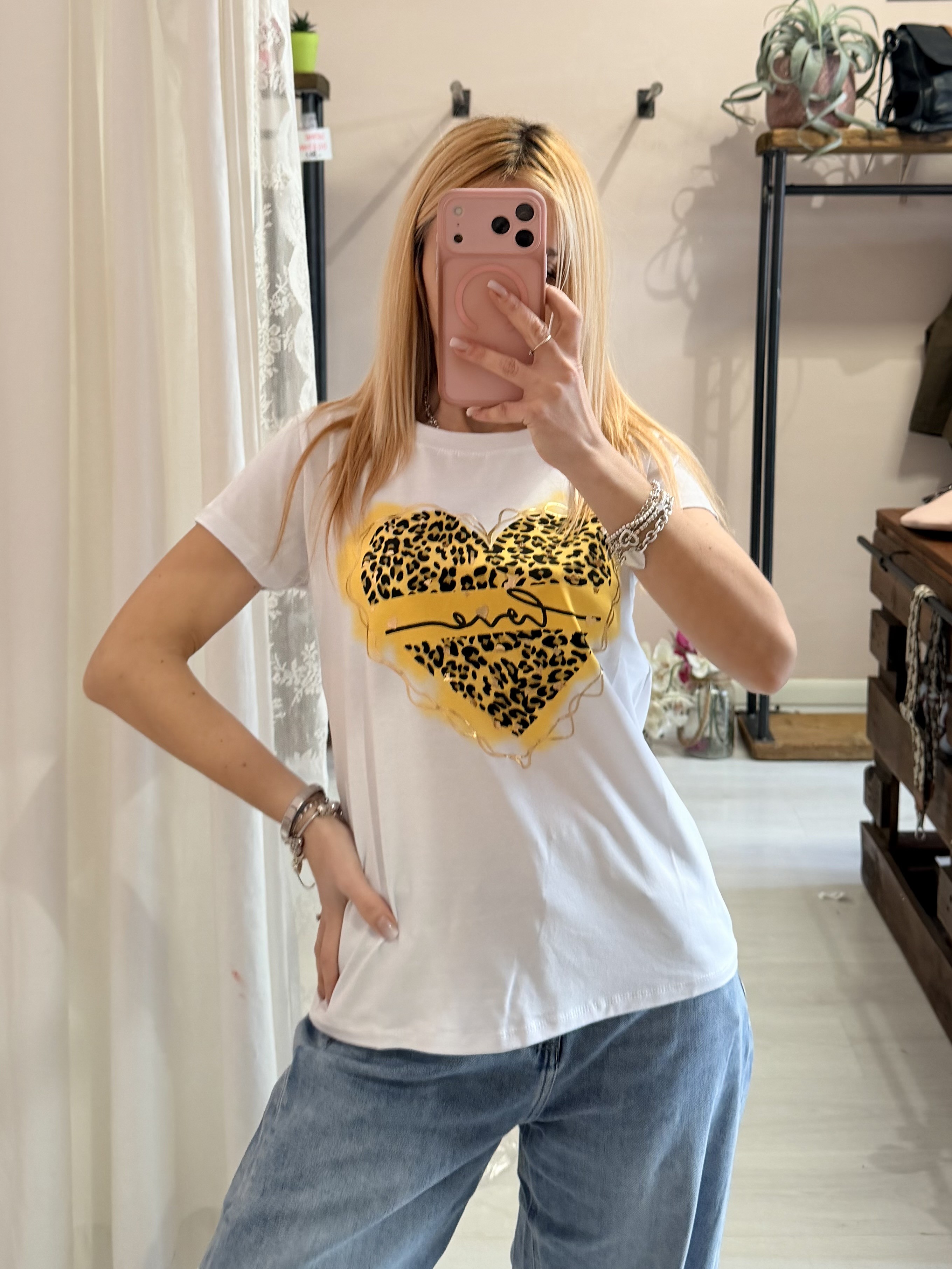 Maglia t shirt cuore leopardato love giallo