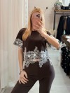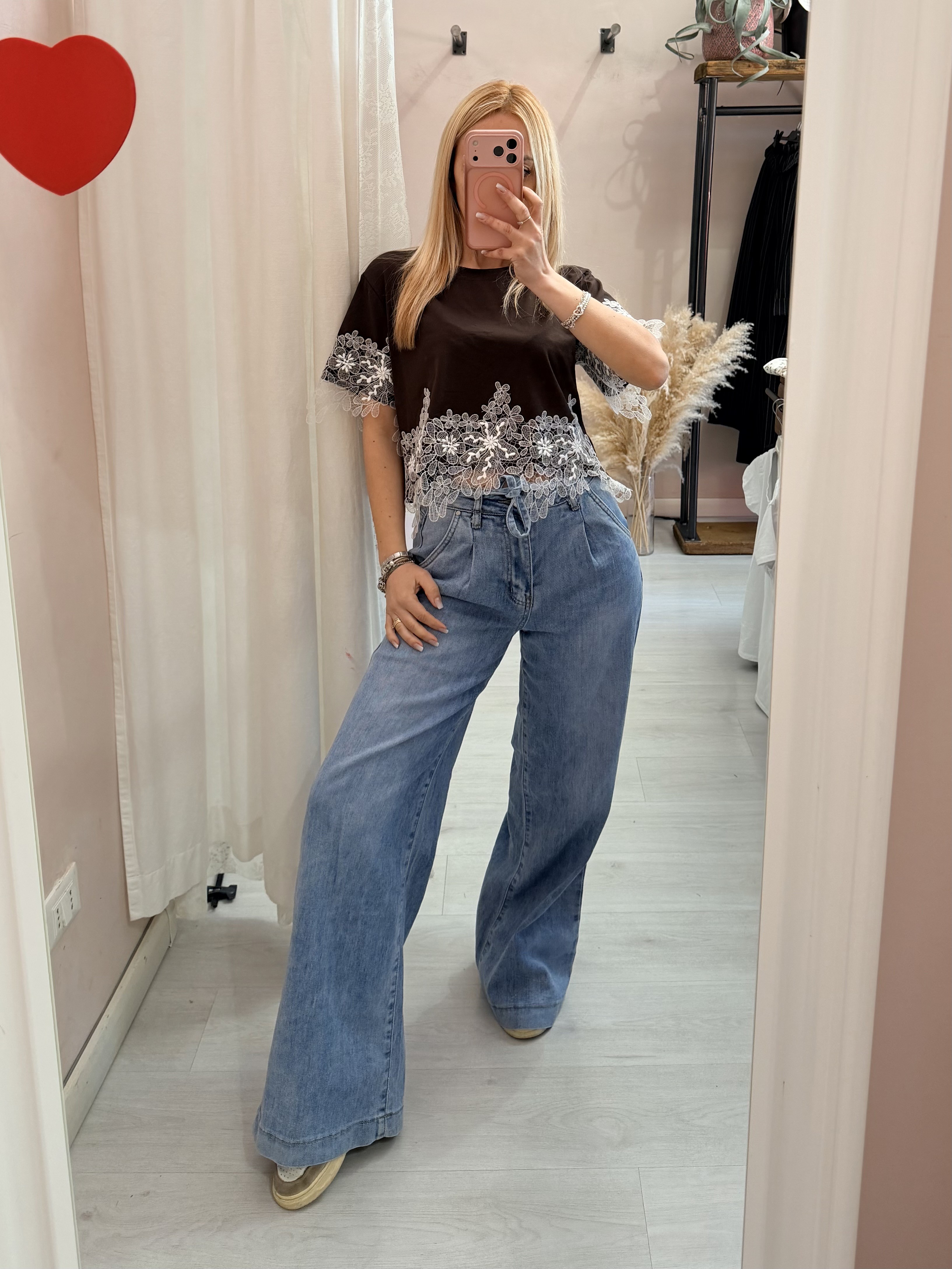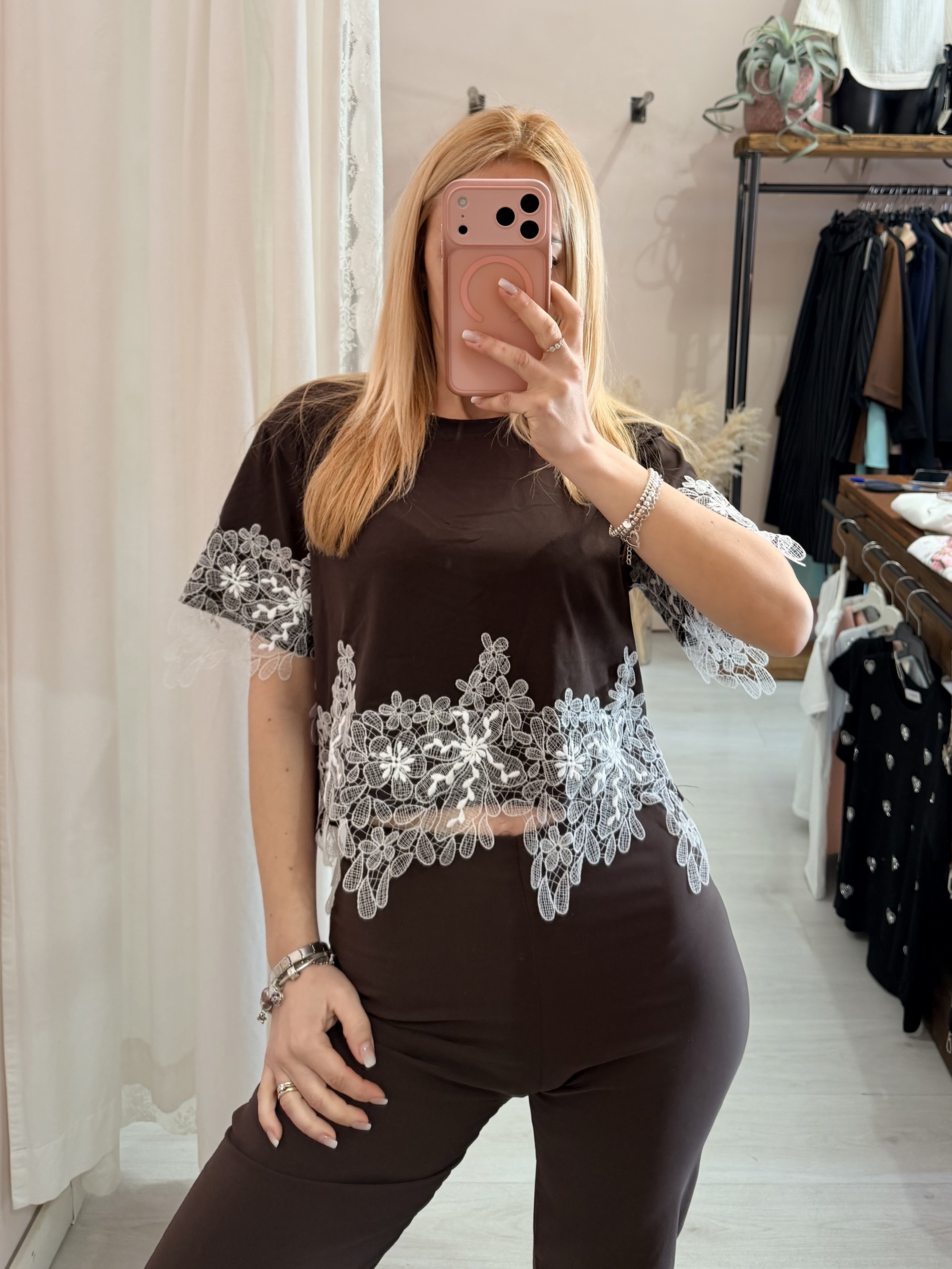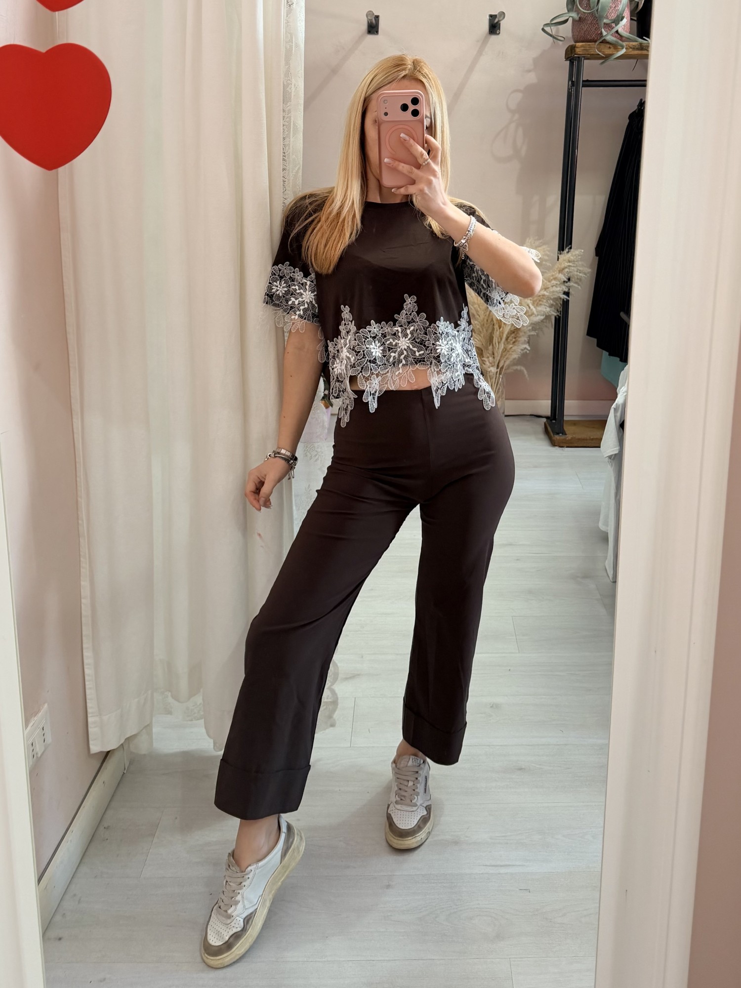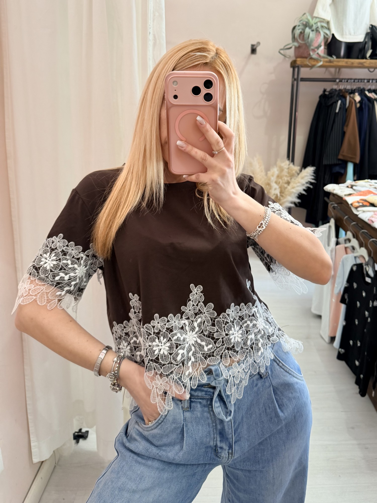 modellino corto arricchita da parte in pizzo alle maniche e al bordo davanti