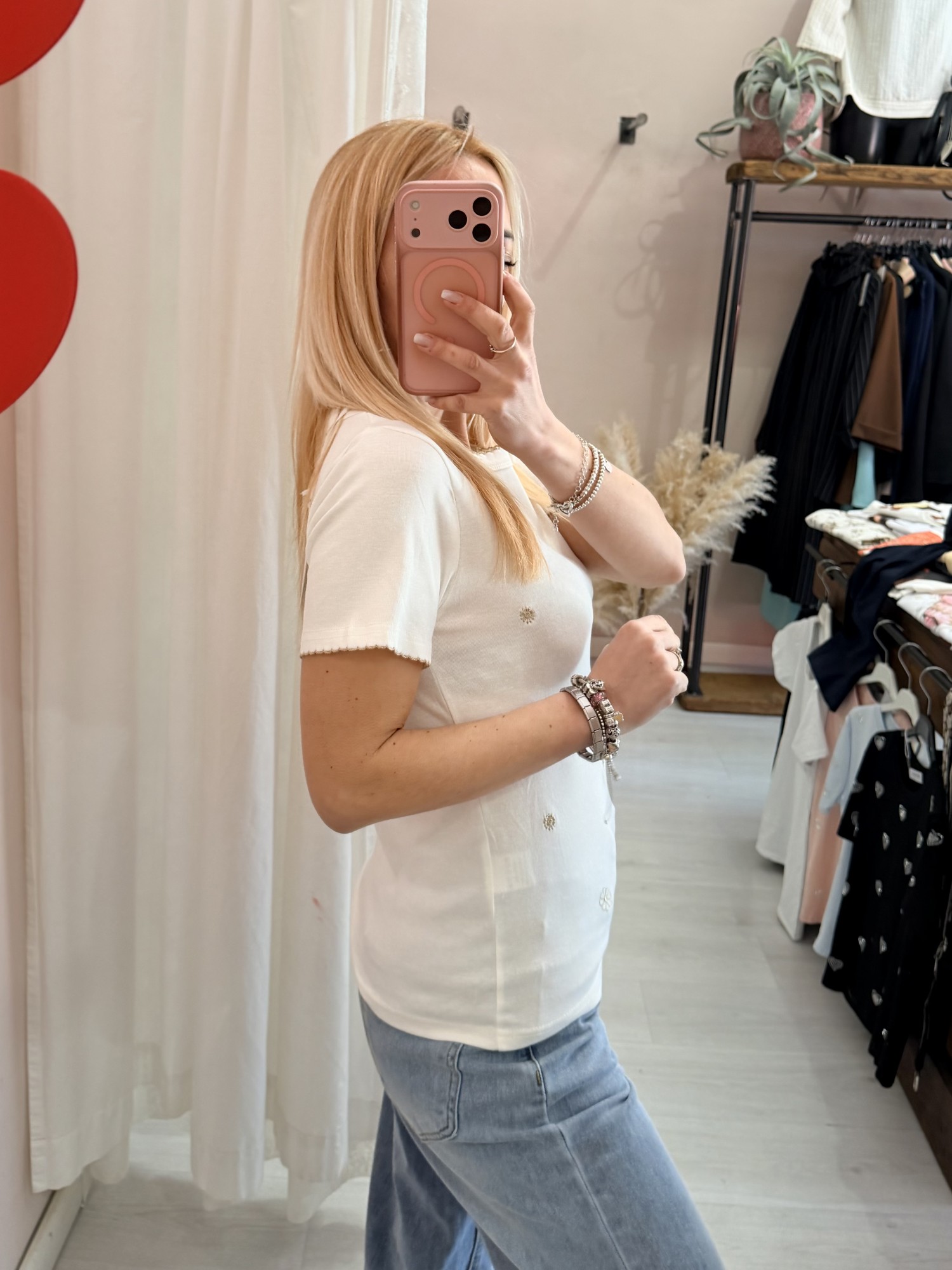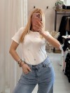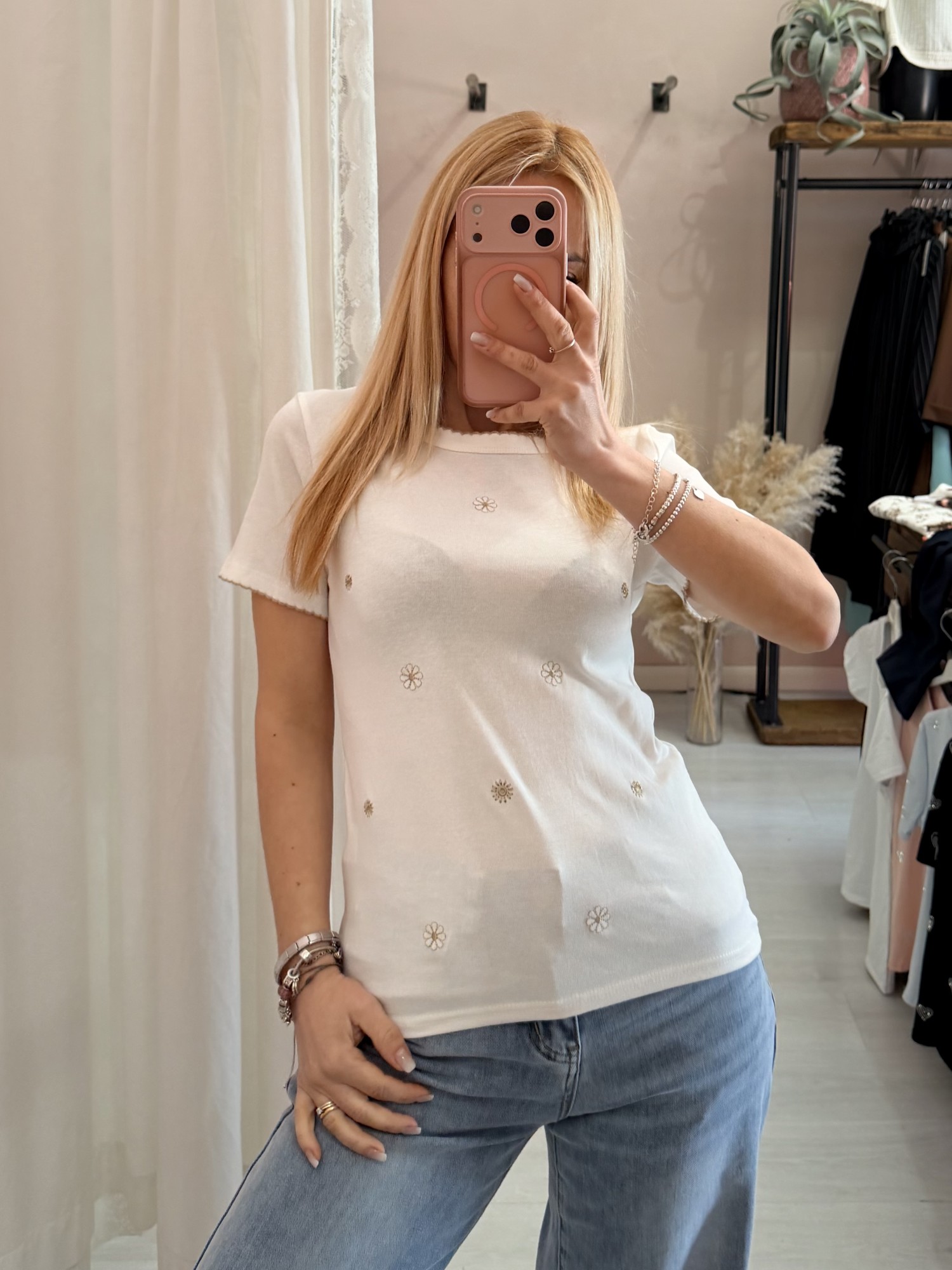 Maglia t shirt bianca fiorellini ricamati beige