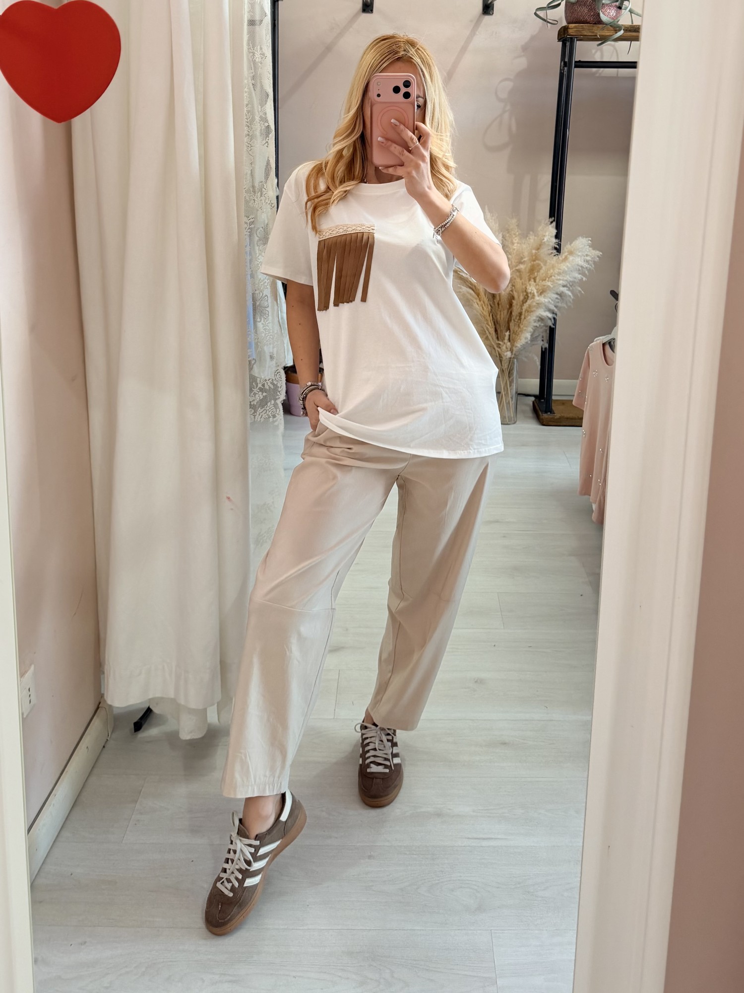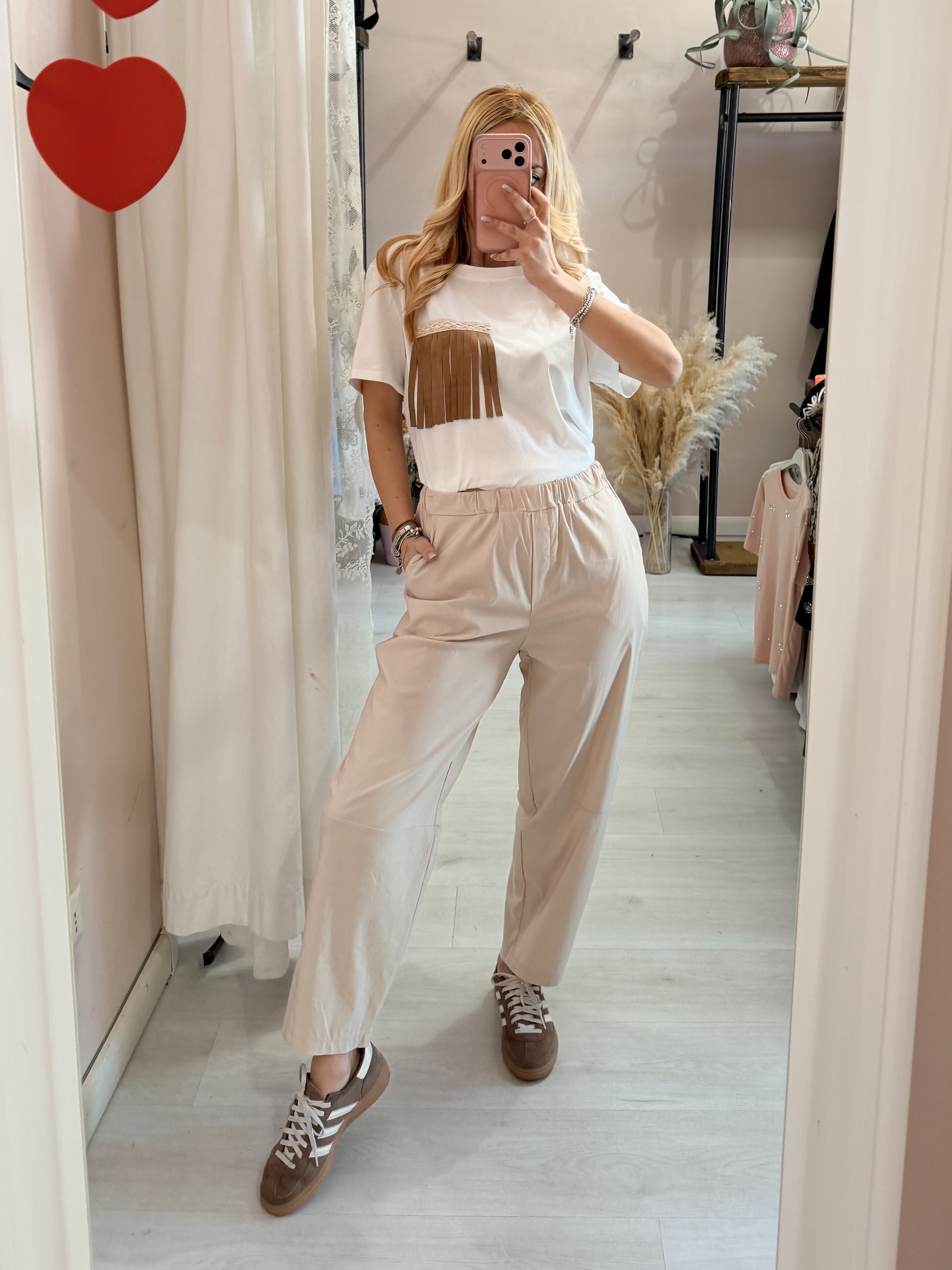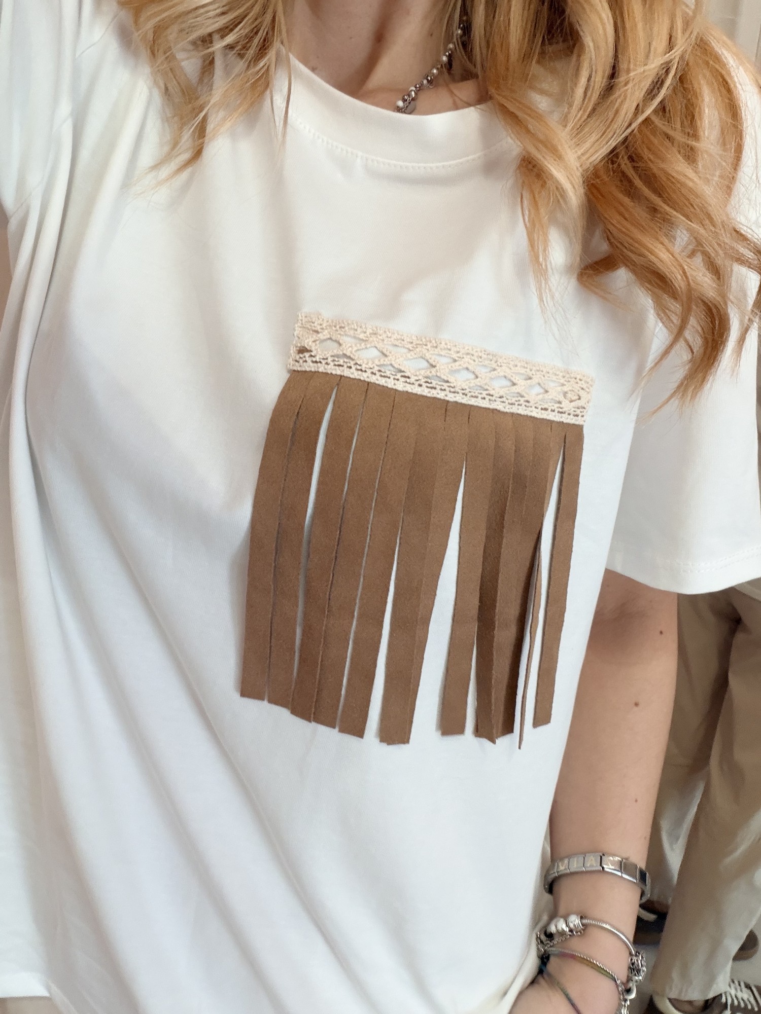 una strisca ricamata da cui partono delle frange scamosciate color camel vanno a formare una finta taschina,