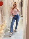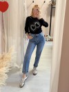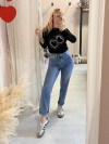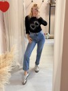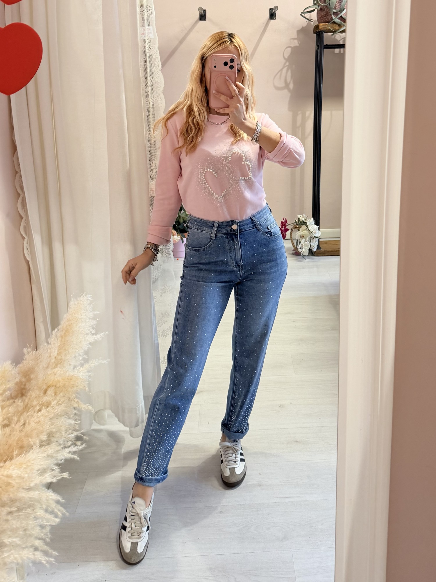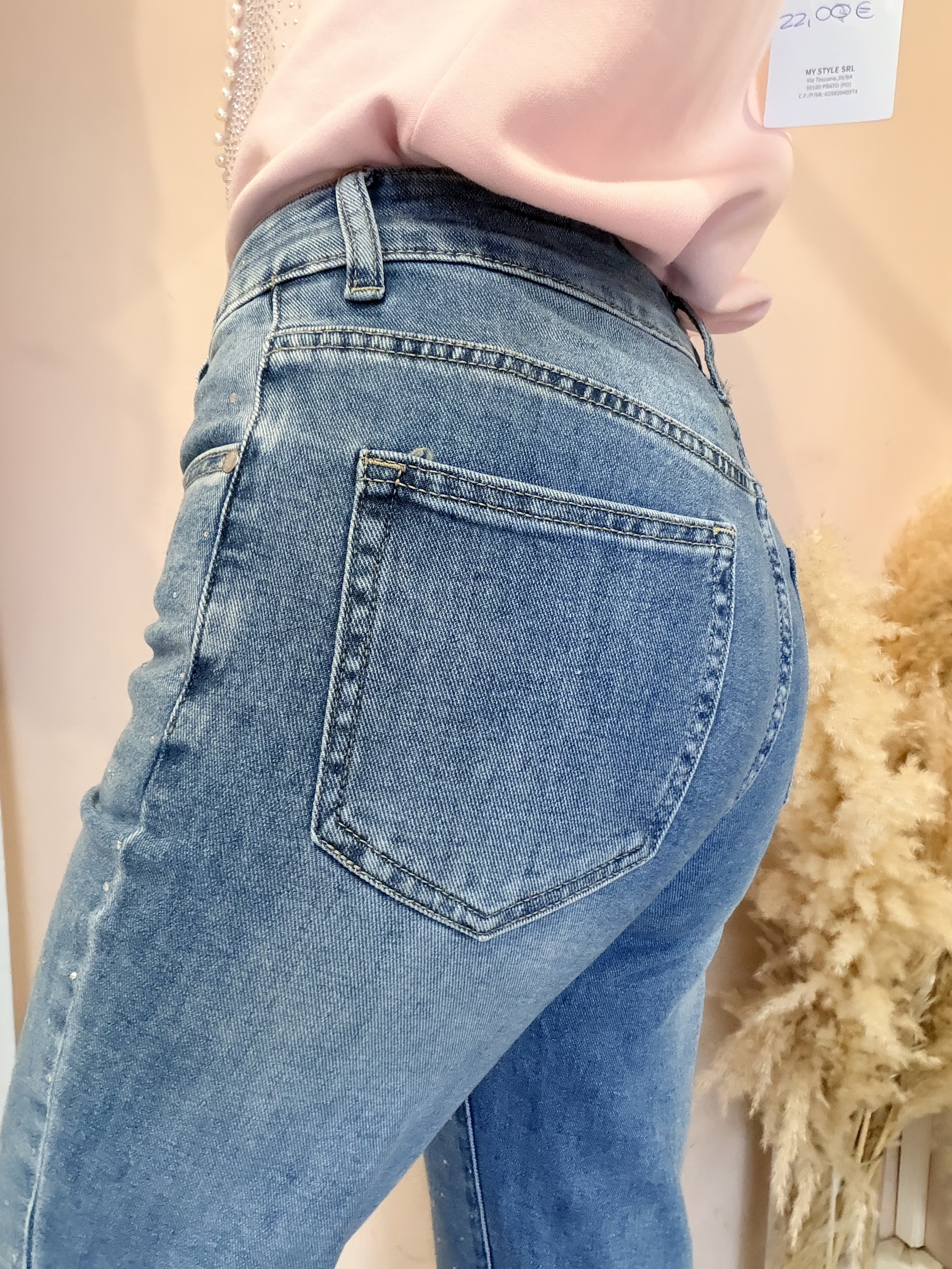 questa variante è un jeans Mom fit: jeans a gamba dritta che si adatta ad ogni silhouette!! La caratteristica distintiva di questo tipo di jeans è la loro capacità di valorizzare ogni tipo di figura. a vita medio-alta, con il loro design intramontabile, sono un elemento chiave in ogni guardaroba per creare tanti outfit diversi, e questa variante con strass ti farà brillare!!! !