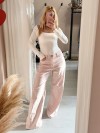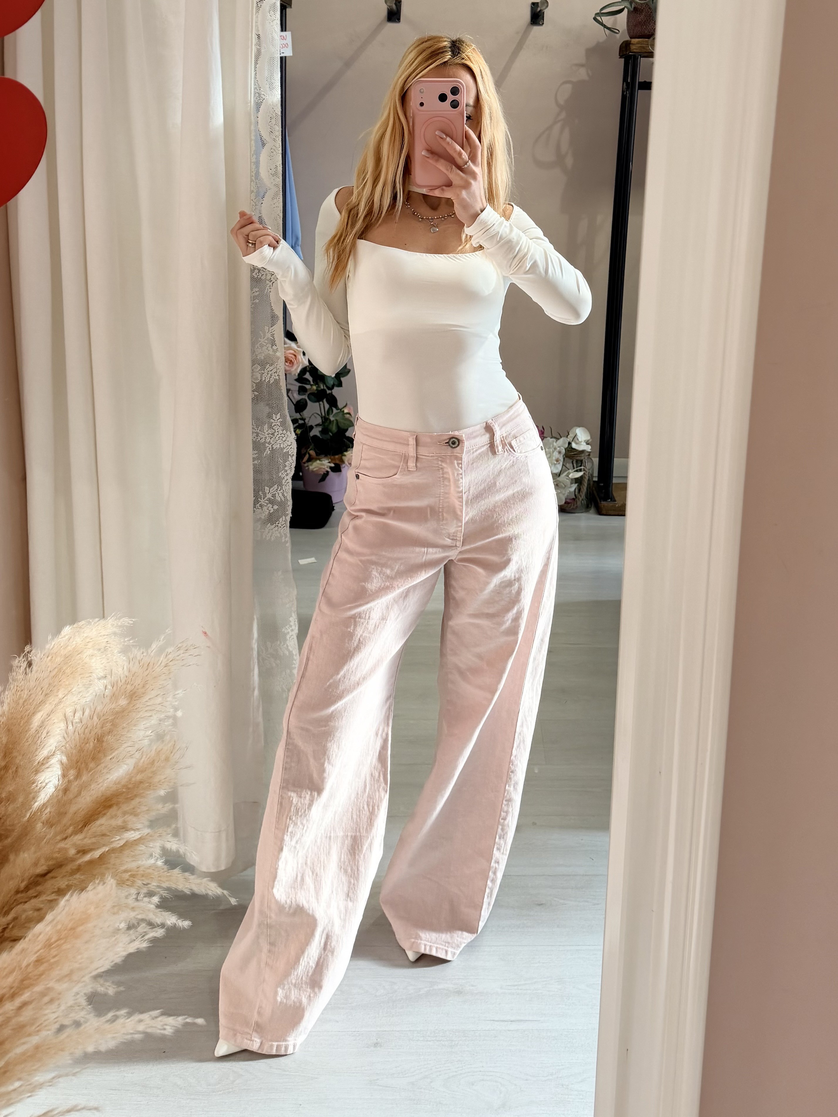 modello a gamba larga in una delicata tonalità rosa pastello che uniscono il look intramontabile del denim a un taglio  di tendenza e rilassato!