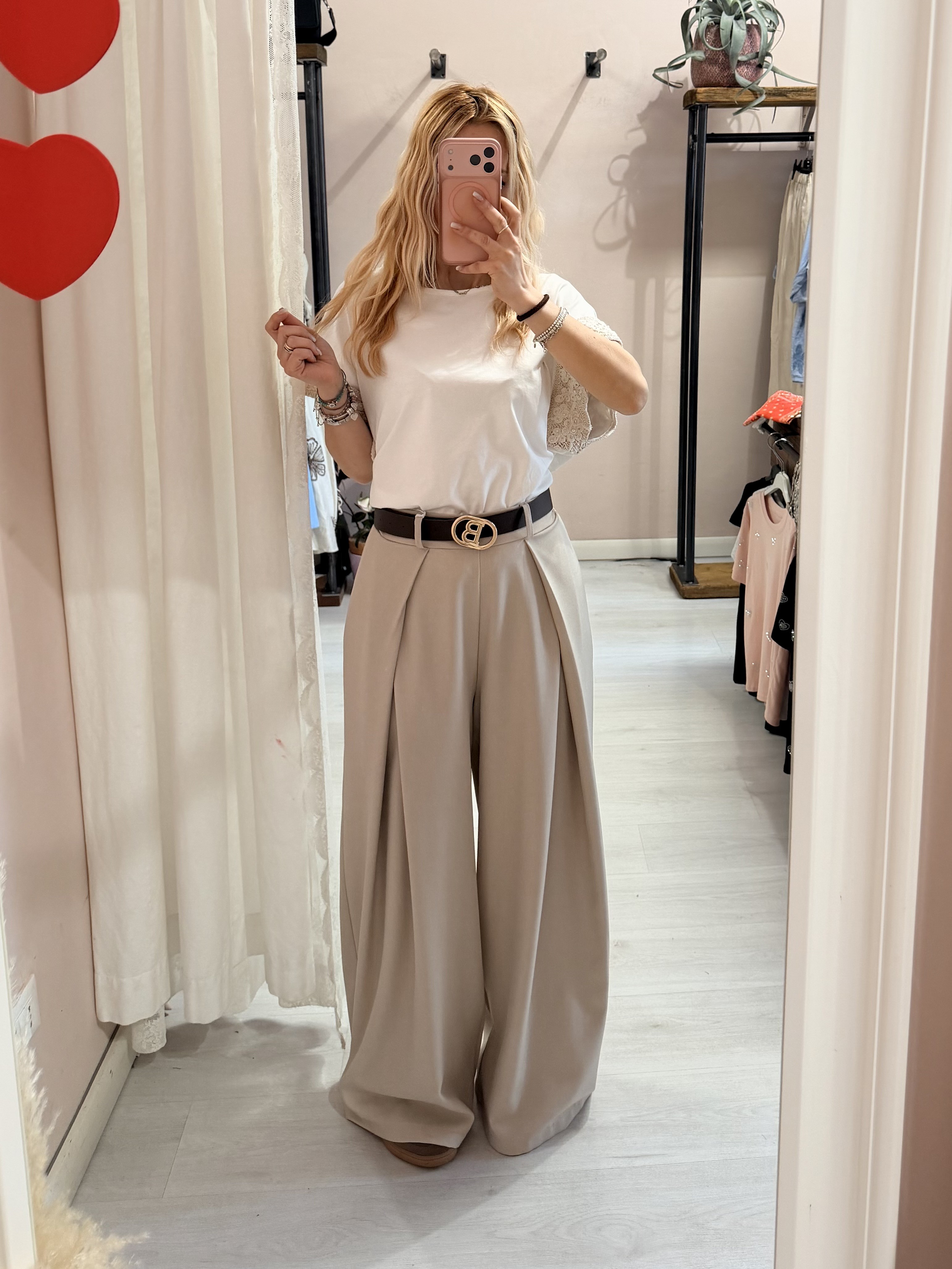 Fine ed elegante, un pantalone che riveste con ampie pieghe davanti