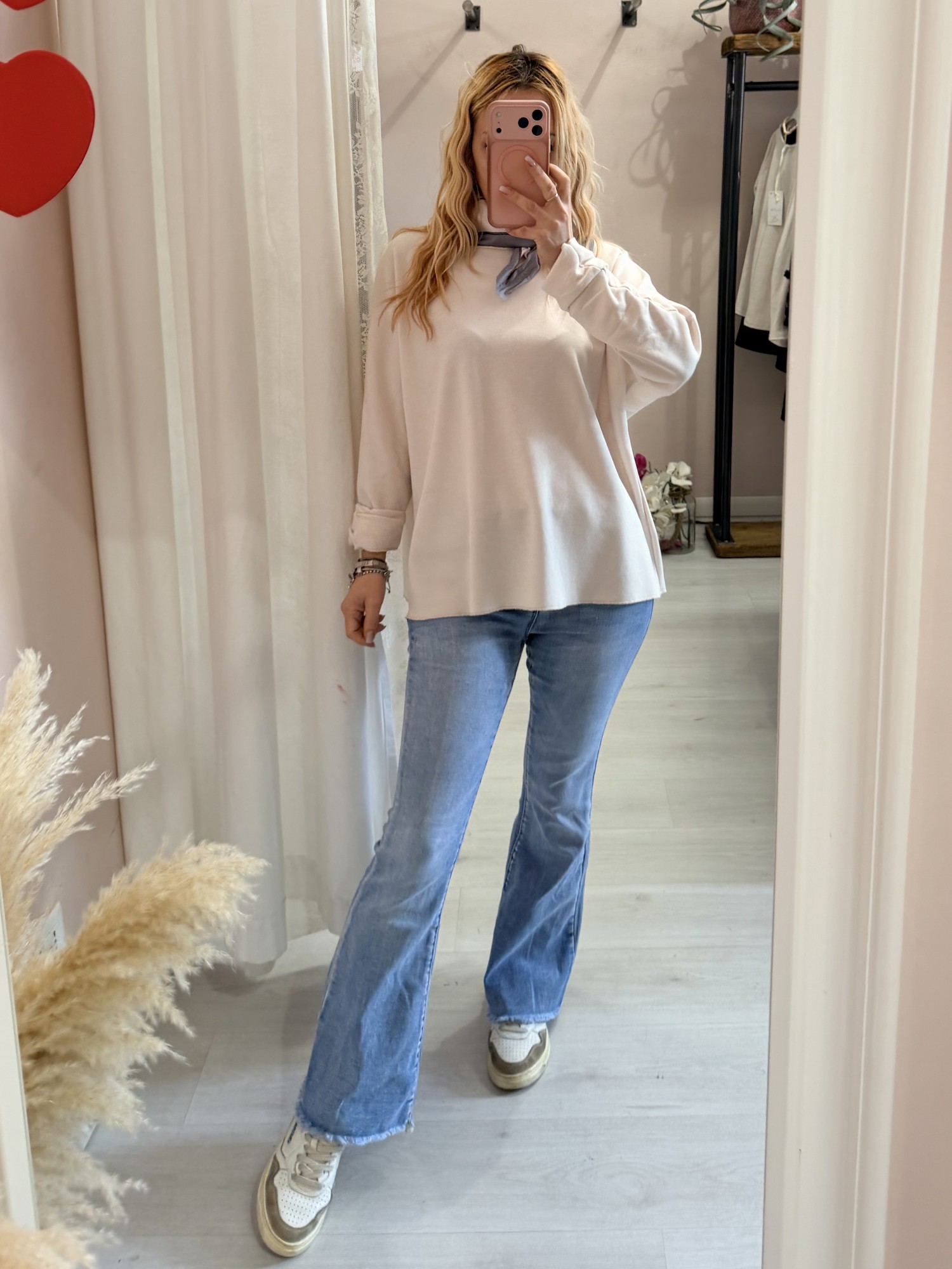Un tessuto morbido ed avvolgente, elastico e con un foularino nclso che si può mettere al collo, ai pantaloni o alla borsa!