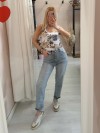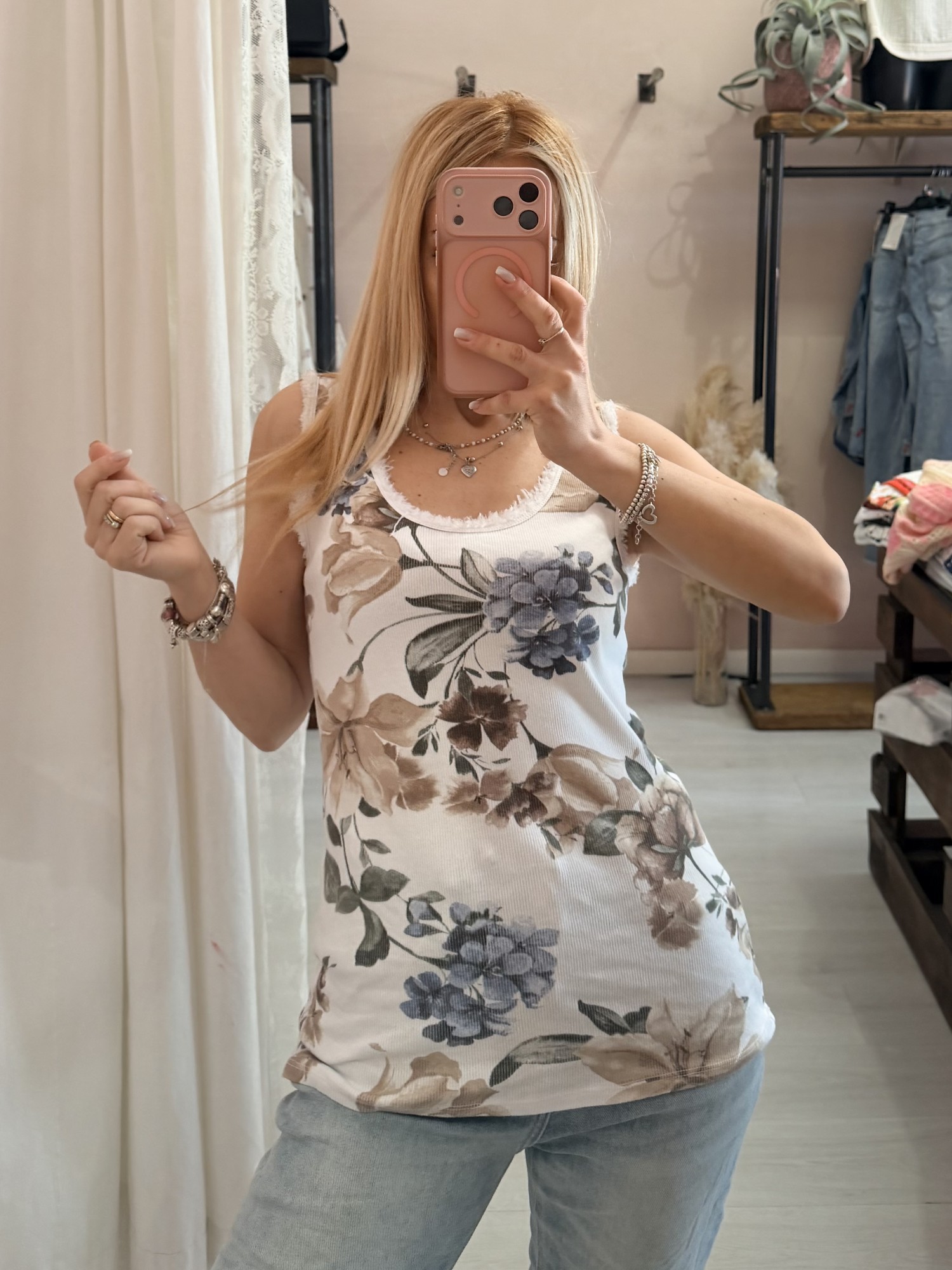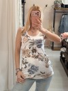 Canotta a costine in fantasia floreale, dai colori del beige blu verde marrone.. sta bene con tantisismi abbinamenti diversi!