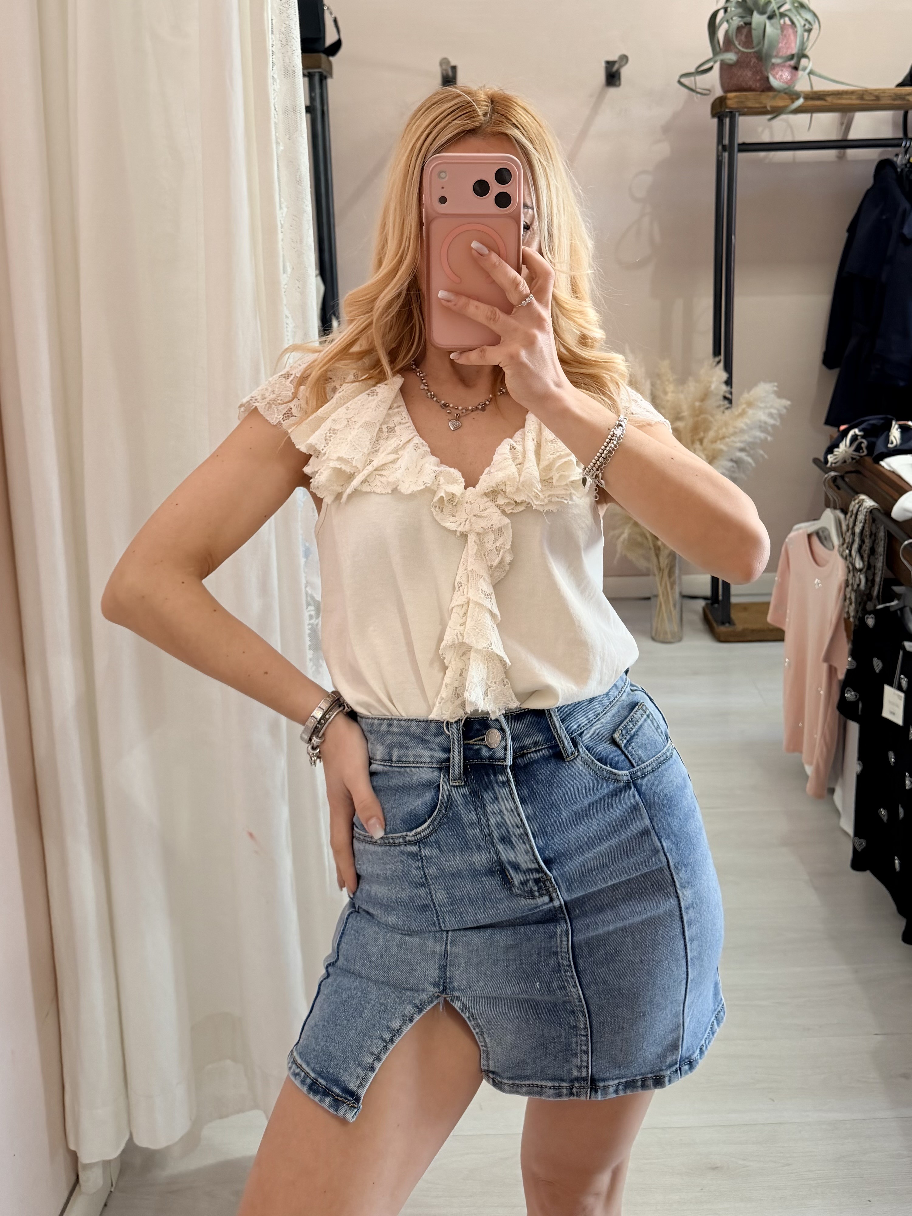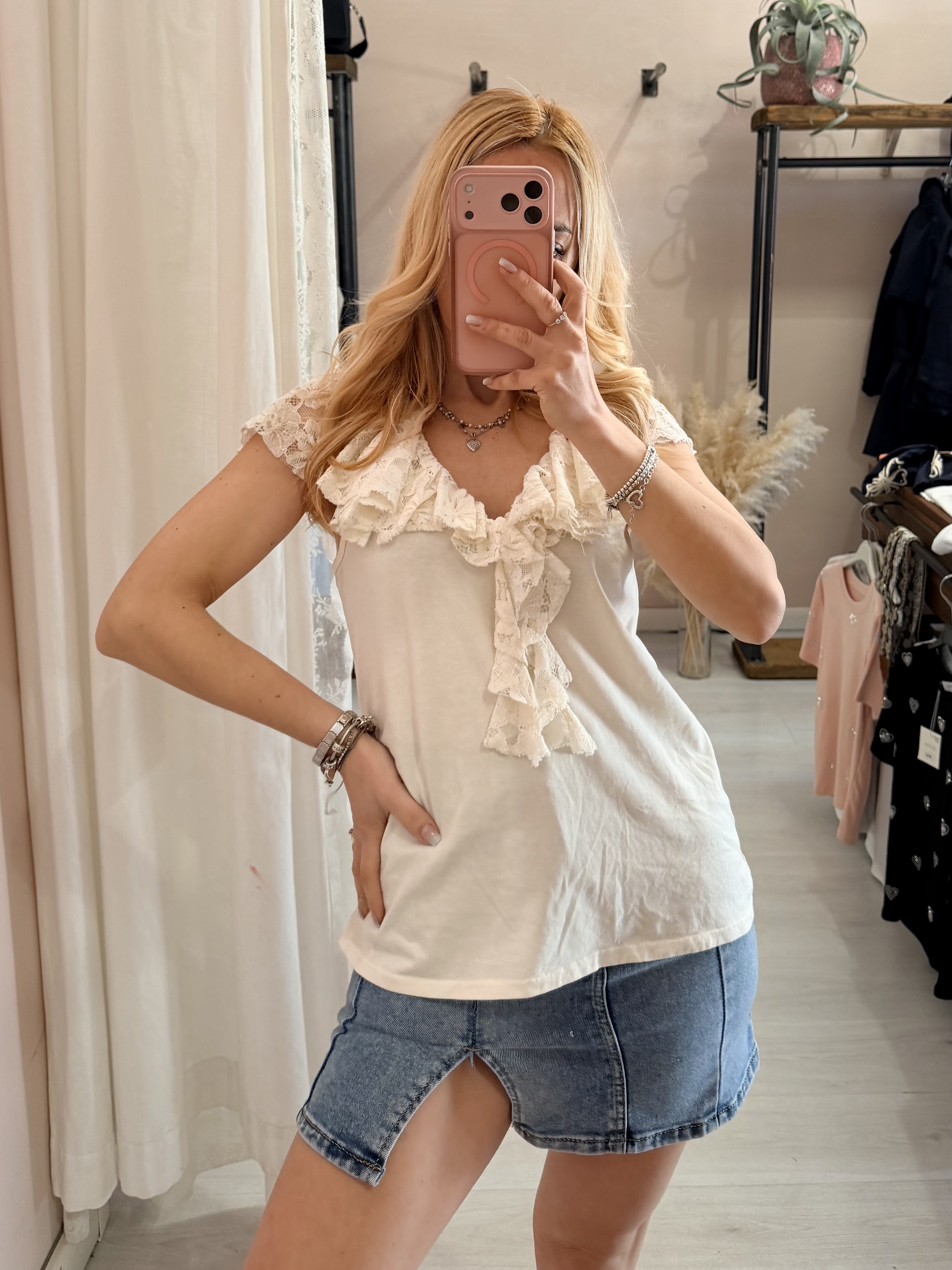 Maglia scollo con ruches in pizzo panna