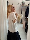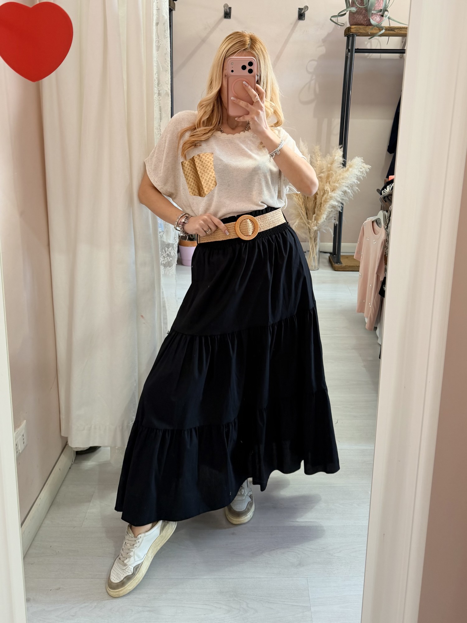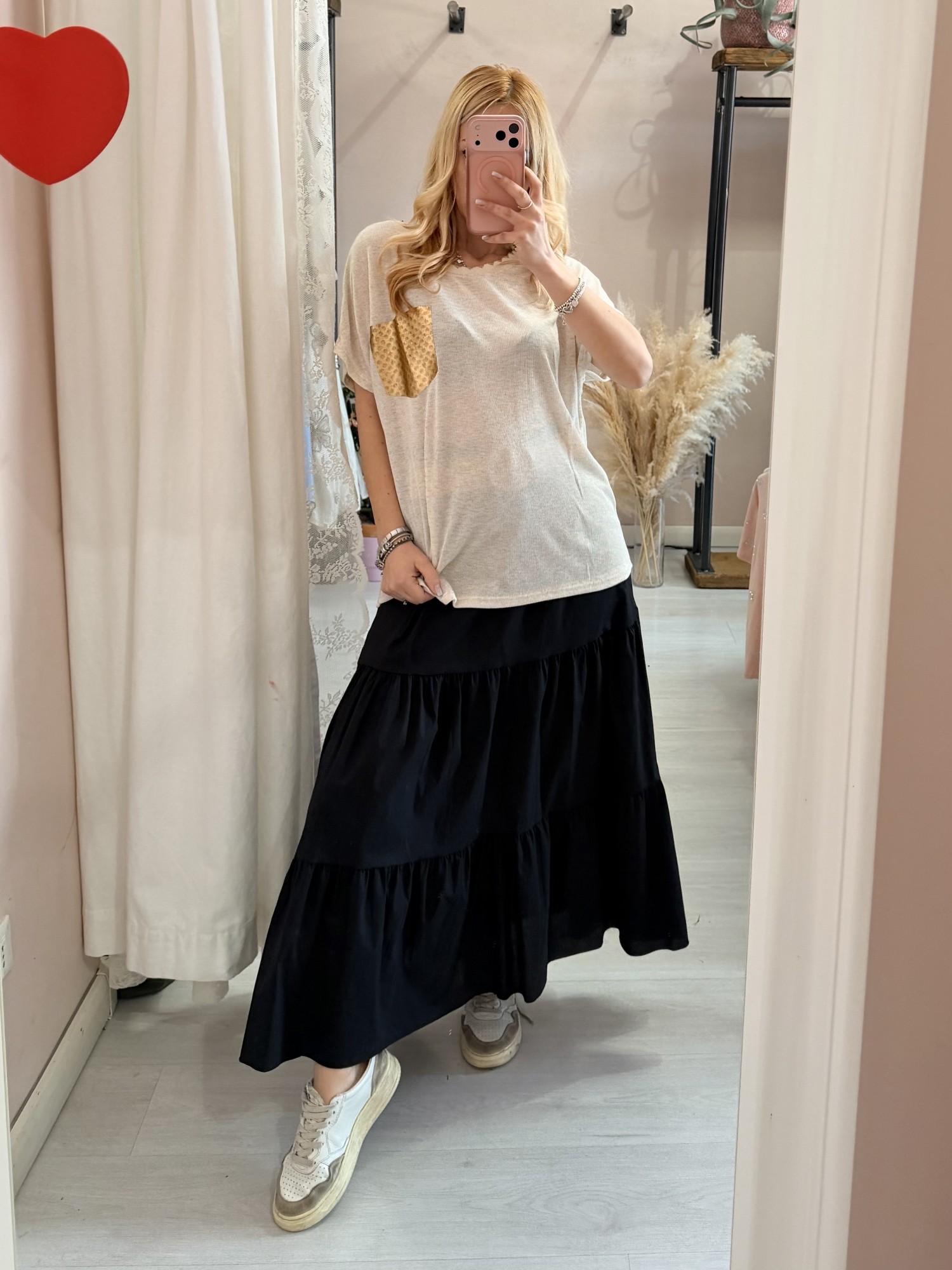 MAgliettina leggera e particolare , dal bordino ondulato dorato  al collo è arricchitina da ha un taschina cangiange oro