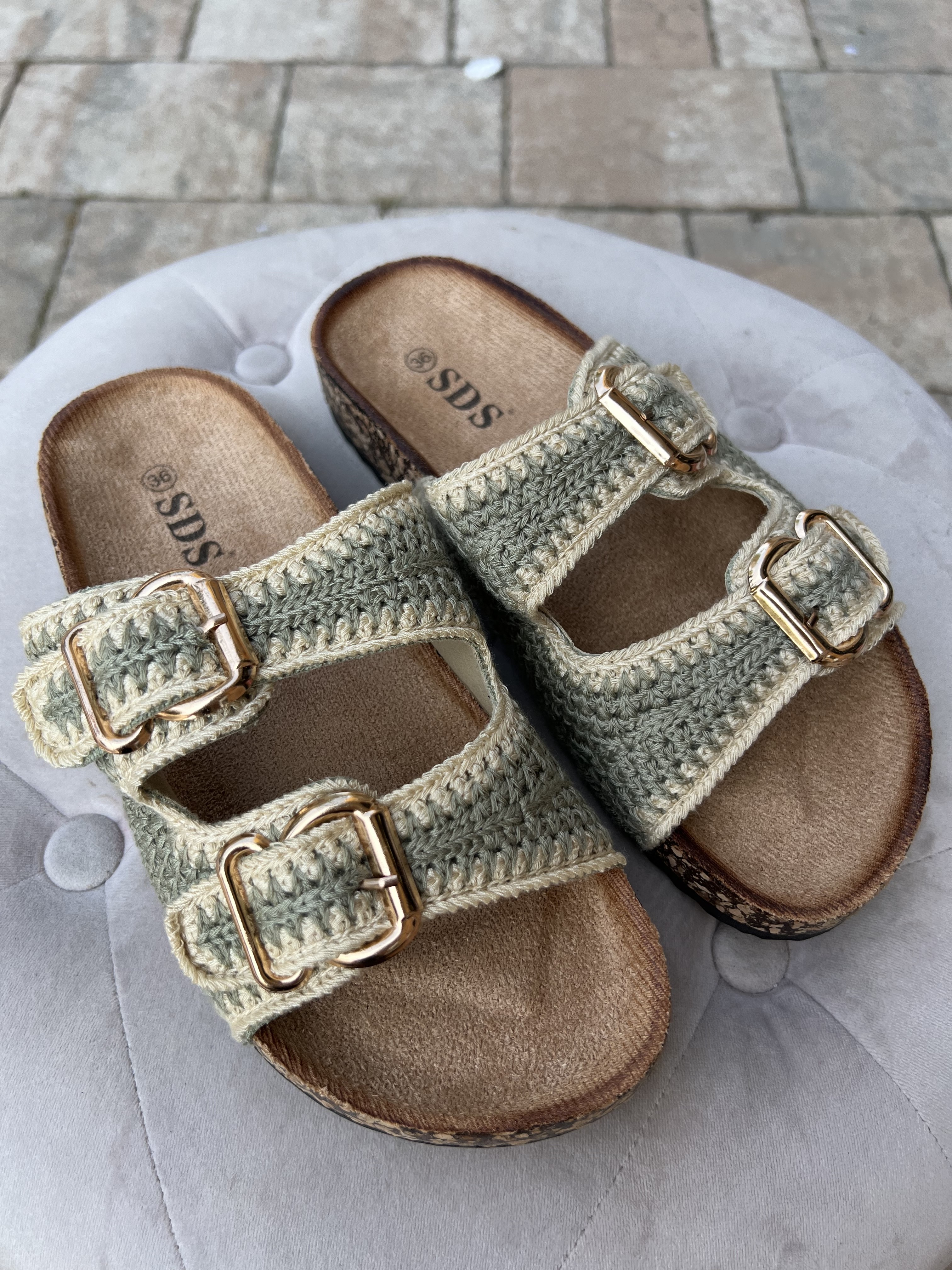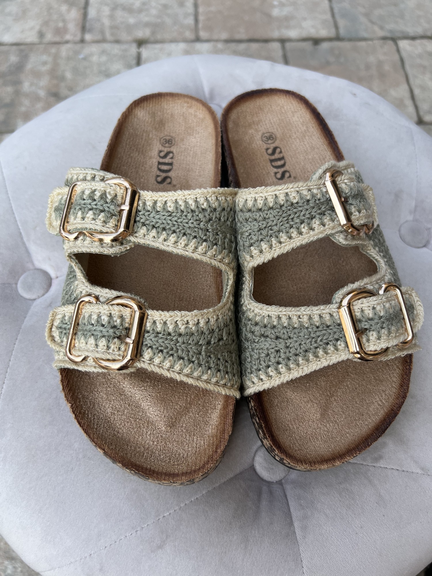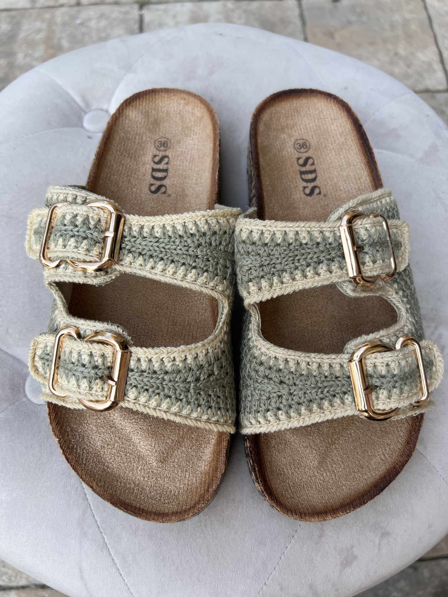 ciabatte birk doppio cinturino ricamato verde e panna.
